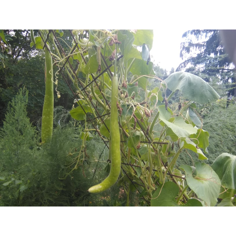 De enige courgette-achtige die ik ken met witte bloemen. De bladeren zijn fluweelzacht en de vrucht kan jong gegeten worden als courgette. Hij klimt graag. Oudere vruchten worden hol en drogen mooi als sierkalebas..