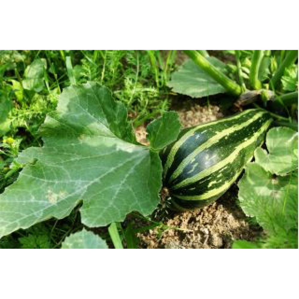 Een mooie courgette, lichtgroen met donkere lengtestrepen. Het lekkerst als hij jong geoogst wordt.