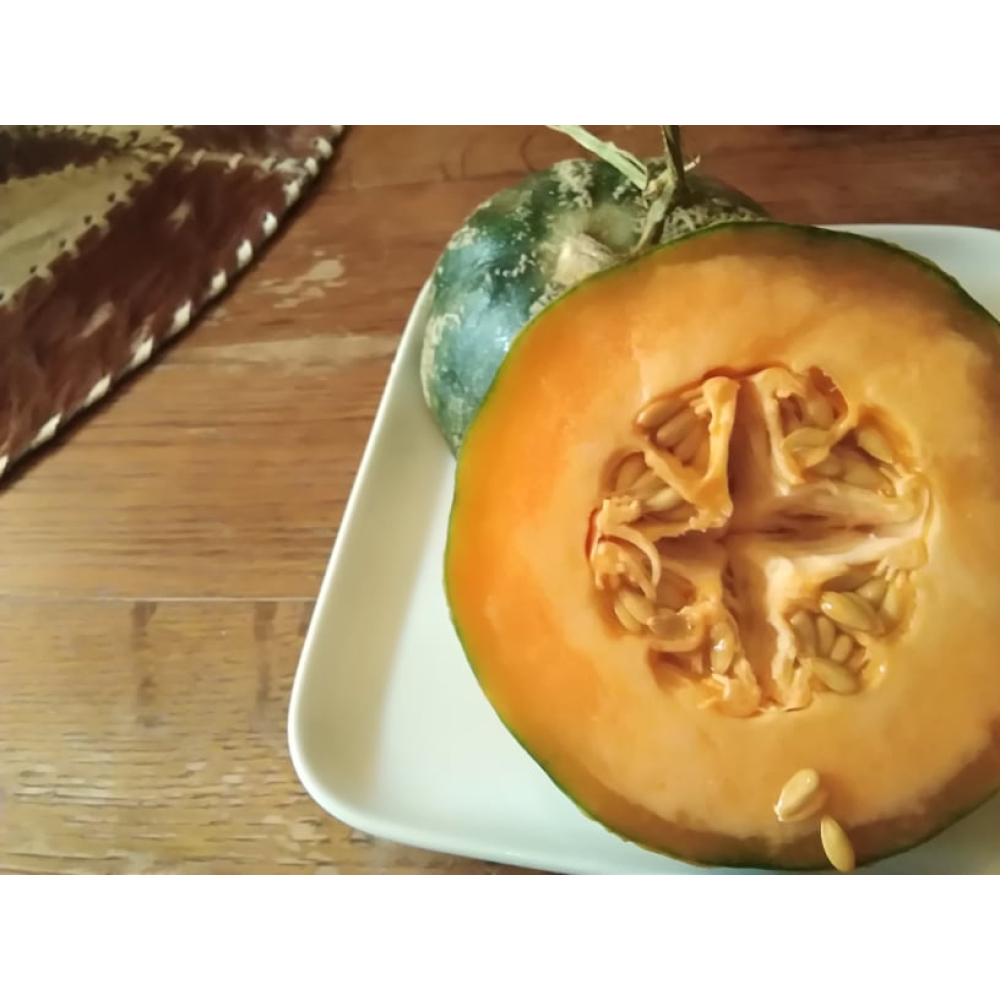 'Ananas d'Amerique à Chair Rouge' Een heel mooi klein meloentje met het formaat van een tennisbal. Superhandig als eenpersoonshapje of als onderdeel van een fruitsalade. Ook heel leuk om te vullen.