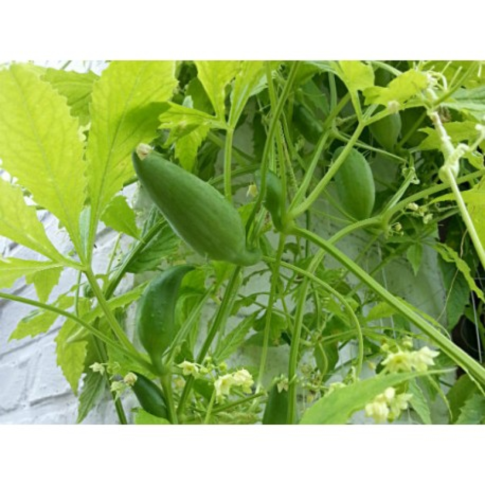 Rankende plant met onopvallende bloemen die veel bijen aantrekt. De kleine vruchtjes smaken naar komkommer en kunnen rauw gegeten worden maar lenen zich ook heel goed voor inmaken in zuur.
