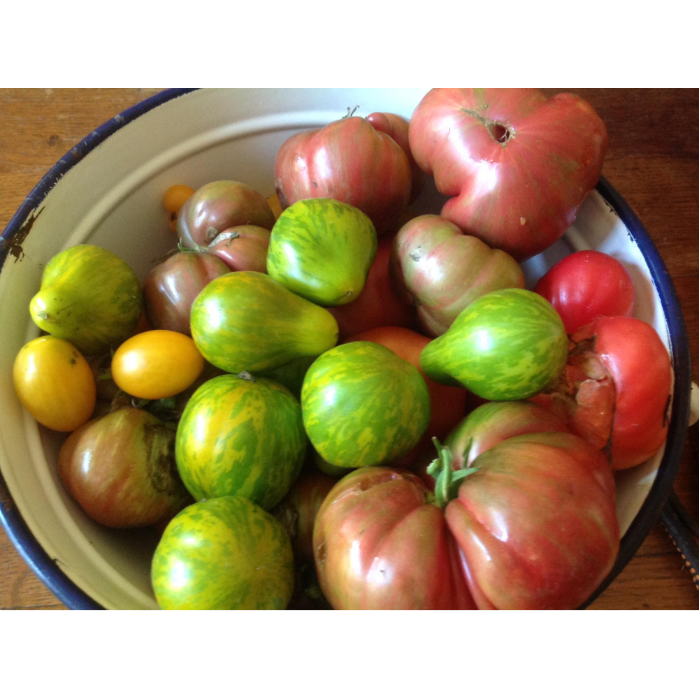 Bijzonder gevormd en gekleurde tomaat. Peervormig geel met groen gestreept, geeft grote en kleine vruchten.