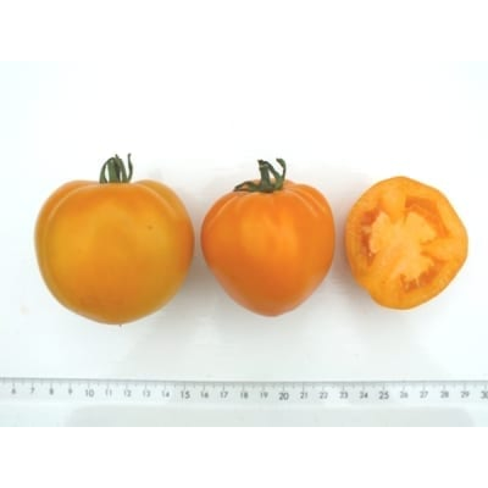 Oranje gele vleestomaat, kan grote exemplaren geven. Prachtige kleur en daarom best tot zijn recht in salades.