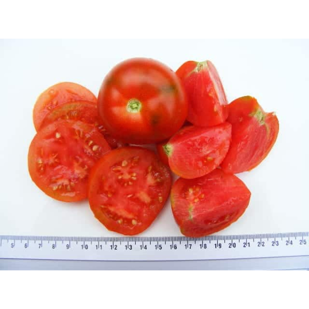 ronde rode tomaat met vaak een klein puntje en soms een lichte hartvorm. Smaak is prima en fris.